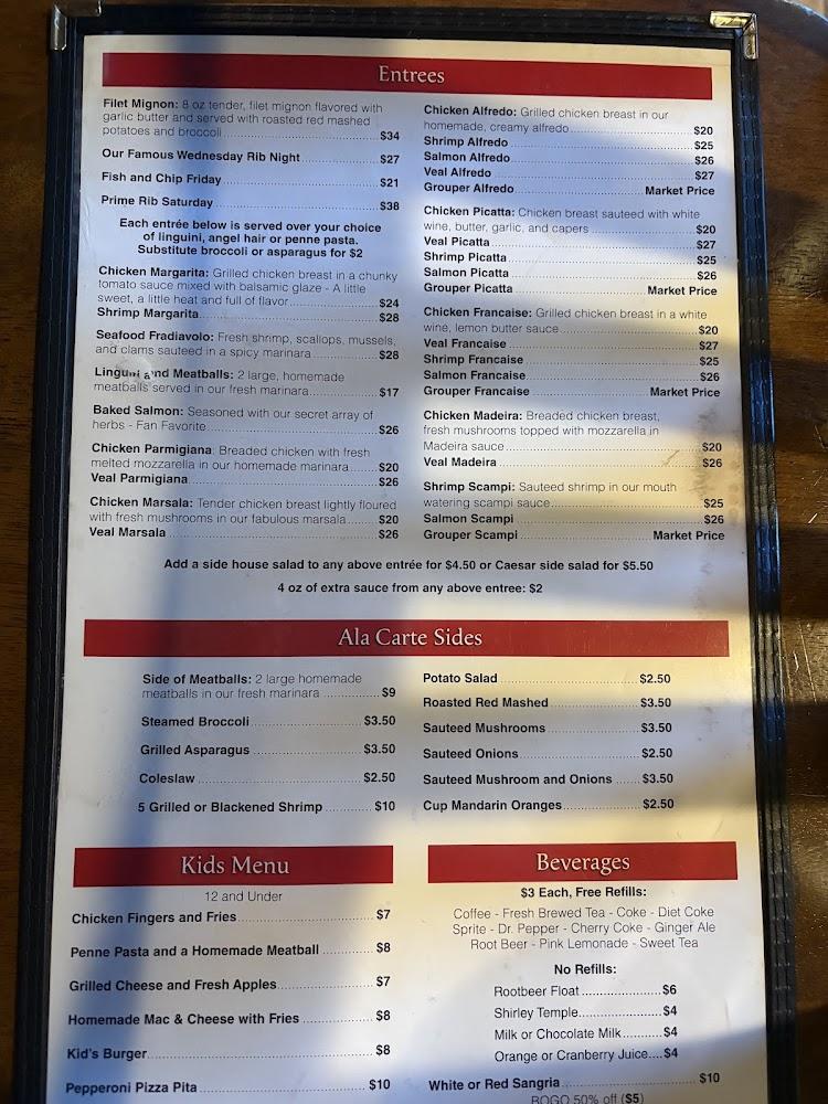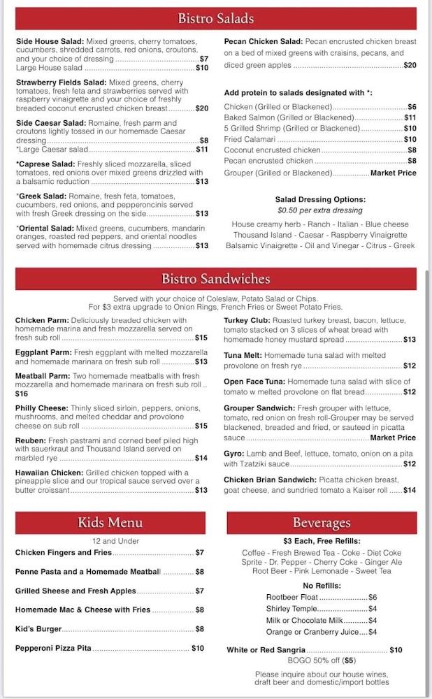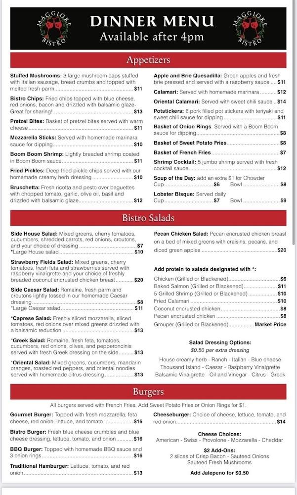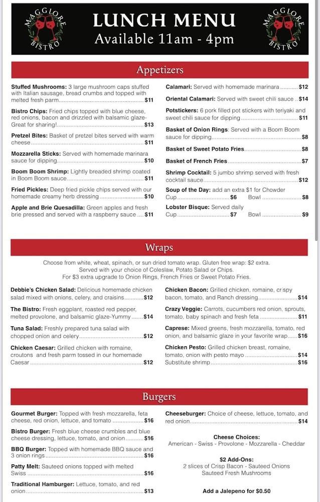 The menu at Maggiore Bistro offers a mix of Italian-inspired dishes and local favorites. Guests can find everything from hearty pastas to satisfying wraps. Don't miss signature items like the Seafood Fradiavolo or Filet Mignon. There's also a children's menu featuring classics to ensure even the pickiest eaters are happy. The bistro is vegetarian-friendly, making it easy to find options for everyone. Desserts include the iconic cannoli, offering a delightful finish to your meal. Drinks, including crafted cocktails, wine, and local beers, complement the menu perfectly. Overall, the variety caters to diverse tastes.